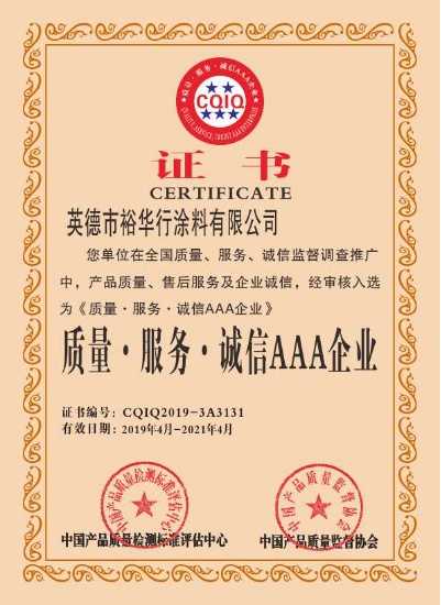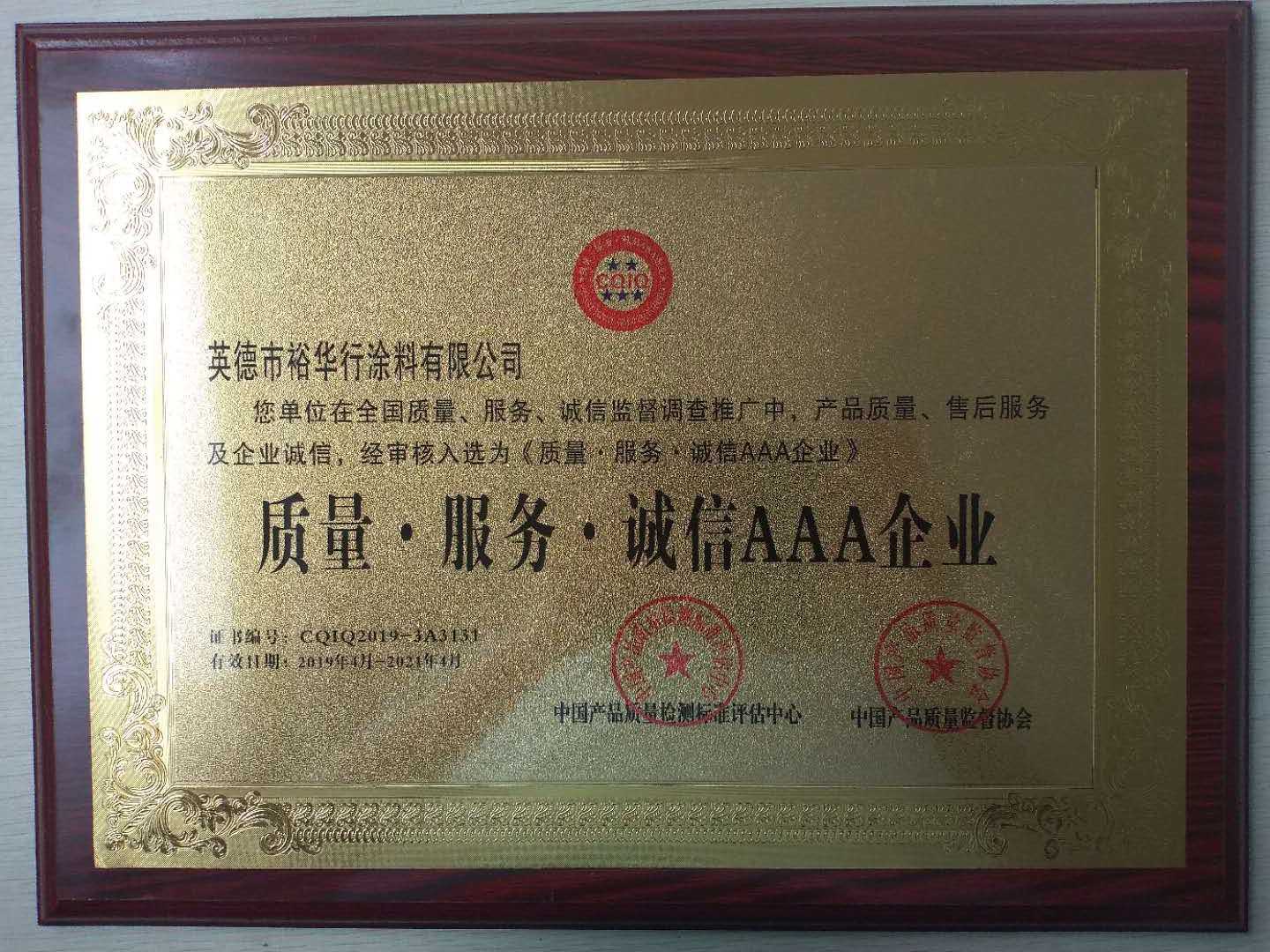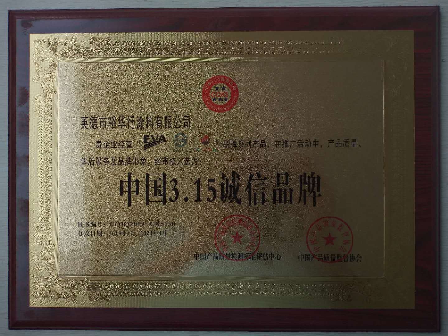 相信品牌力量,英德市裕华行涂料有限公司旗下的“EVA”、“77GLOMAX”、“ICAR”凭借自身雄厚的企业实力、强大的品牌影响力与优质的产品和服务,荣获由中国产品质量标准评估中心和中国质量监督协会共同颁发的“中国3.15诚信品牌”、“绿色节能环保推广产品”、“质量 服务 诚信AAA企业”、“中国名优产品”四个奖项!